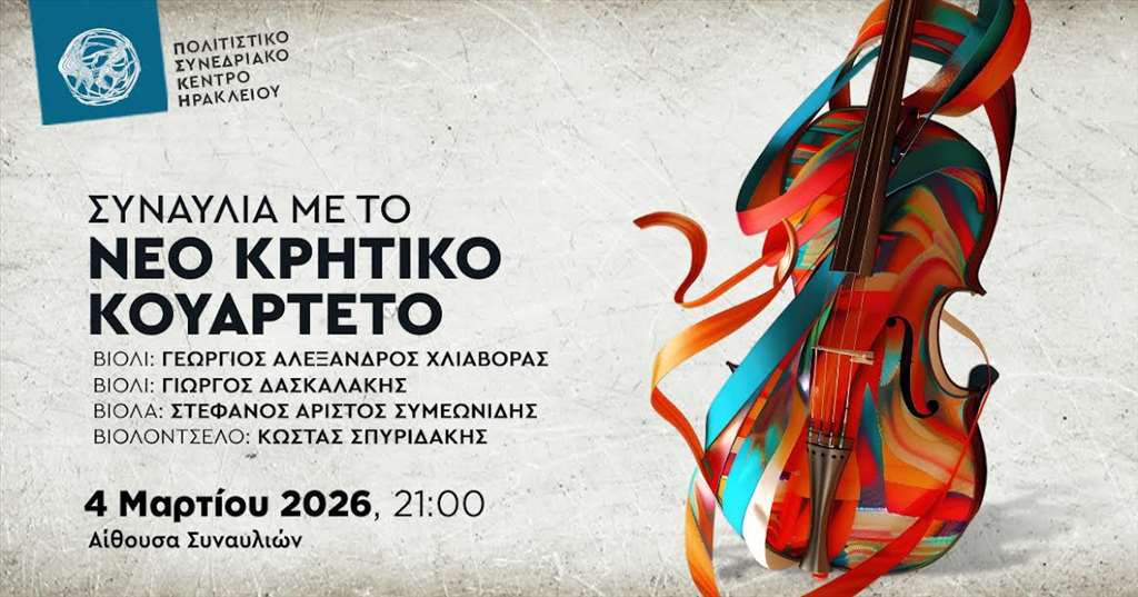 Το Νέο Κρητικό Κουαρτέτο, μέλος της πανευρωπαϊκής πλατφόρμας ανάδειξης νέων κουαρτέτων Merita και του γαλλικού ιδρύματος ProQuartet για την στήριξη κουαρτέτων σε όλη την Ευρώπη, σας προσκαλεί σε ακόμη μια βραδιά κουαρτέτων του διεθνούς ρεπερτορίου, αλλά και σημαντικών Ελλήνων συνθετών.