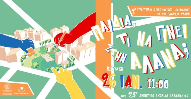 «Παιδιά, τι να γίνει στην Αλάνα;». Στο Δήμο Καλαμαριάς τα ερωτήματα που αφορούν στην πόλη μας και το μέλλον της δεν είναι ρητορικά… Και σήμερα Κυριακή 26 Ιανουαρίου στο Βυζάντιο θα γραφεί μία νέα σελίδα για μια γειτονιά της Καλαμαριάς, καθώς για πρώτη φορά παιδιά καλούνται να σχεδιάσουν το πάρκο της γειτονιάς τους! Μετά το πρώτο εργαστήριο συμμετοχικού σχεδιασμού στην περιοχή του Βυζαντίου, η δημοτική αρχή της Καλαμαριάς, στο πλαίσιο της δέσμευσής της για συμμετοχή των πολιτών στη λήψη αποφάσεων που αφορούν στη ζωή και το μέλλον τους, έρχεται ένα εργαστήρι αποκλειστικά για παιδιά. Στο πλαίσιο του Μνημονίου Συνεργασίας που έχει υπογράψει ο Δήμος Καλαμαριάς με το Εργαστήριο Co-Space του Τμήματος Μηχανικών Χωροταξίας και Ανάπτυξης του ΑΠΘ, έρχεται η δεύτερη ανοιχτή διαδικασία συμμετοχικού σχεδιασμού για τον επανασχεδιασμό του Πάρκου Ρόδων, της Αλάνας, όπως είναι γνωστή στην περιοχή.