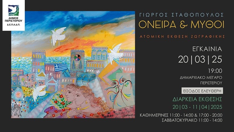 Μέχρι και το Σάββατο 12 Απριλίου 2025 θα φιλοξενείται η θαυμάσια έκθεση ζωγραφικής «ΟΝΕΙΡΑ & ΜΥΘΟΙ» του καταξιωμένου εικαστικού Γιώργου Σταθόπουλου, στην αίθουσα τέχνης του Δημαρχιακού Μεγάρου (Καραθεοδωρή & Εθν. Αντιστάσεως – στάση Μετρό «Περιστέρι»).
