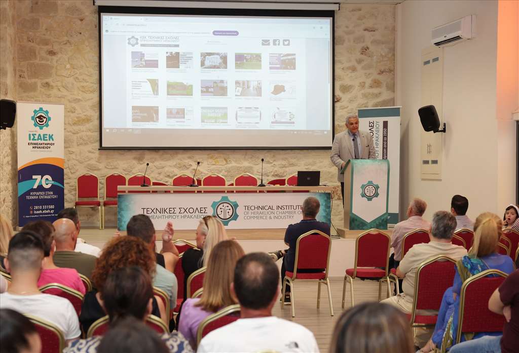 Κατά τον χαιρετισμό του, ο Πρόεδρος του Επιμελητηρίου Ηρακλείου και Πρόεδρος των Τεχνικών Σχολών του Επιμελητηρίου Ηρακλείου κ. Βαγγέλης Καρκανάκης υπογράμμισε τη σημασία της τεχνικής εκπαίδευσης για την οικονομική ανάπτυξη της Κρήτης, τονίζοντας ότι ο εκπαιδευτικός φορέας του Επιμελητηρίου Ηρακλείου, με περισσότερα από 70 χρόνια εκπαιδευτικής γνώσης και εμπειρίας "δεν διδάσκει απλά, αλλά μεταμορφώνει νέους ανθρώπους σε εξειδικευμένα στελέχη, χτίζοντας σε γερές βάσεις το επαγγελματικό τους μέλλον". Απευθυνόμενος στους ίδιους τους σπουδαστές και τους αποφοίτους είπε χαρακτηριστικά: "Η Κρήτη χρειάζεται τα χέρια σας, τη δημιουργικότητά σας, το πάθος σας. Αυτός ο τόπος δεν έχει ανάγκη μόνο από εργάτες, χρειάζεται πρωτίστως ηγέτες, δημιουργούς, οραματιστές."