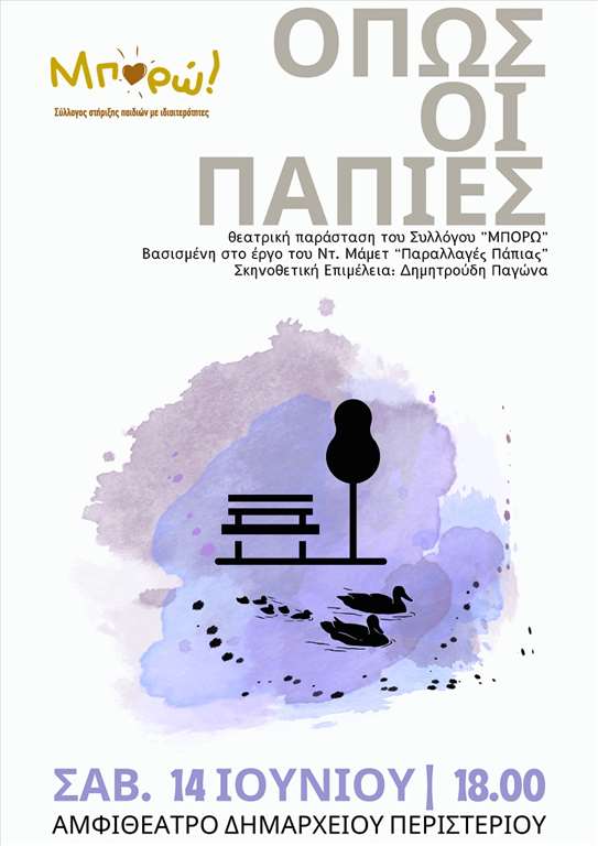 Ο Σύλλογος στήριξης παιδιών με ιδιαιτερότητες «ΜΠΟΡΩ» παρουσιάζει τη θεατρική παράσταση «Όπως οι Πάπιες», βασισμένη στο έργο του Ντ. Μάμετ «Παραλλαγές Πάπιας», σε σκηνοθετική επιμέλεια της Δημητρούδης Παγώνας.
