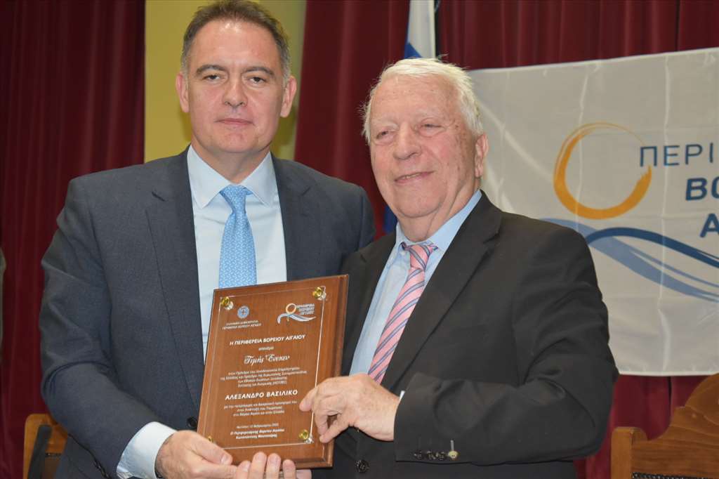 Η Περιφέρεια Βορείου Αιγαίου και ο Περιφερειάρχης Κωνσταντίνος Μουτζούρης τίμησαν χτες τον Πρόεδρο του Ξενοδοχειακού Επιμελητηρίου Ελλάδος και Πρόεδρο της Ευρωπαικής Συνομοσπονδίας των Εθνικών Ενώσεων Ξενοδοχίας , Εστίασης και Αναψυχής (HOTREC), εκ Λήμνου καταγόμενο, Αλέξανδρο Βασιλικό, σε εκδήλωση που πραγματοποιήθηκε στην αίθουσα του Περιφερειακού Συμβουλίου.