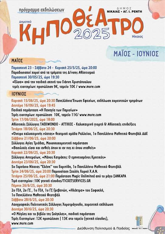 Το Δημοτικό Κηποθέατρο Νίκαιας (Κύπρου και Προύσσης) ανοίγει τις πύλες του και φέτος, για να φιλοξενήσει μια σειρά πολιτιστικών εκδηλώσεων μέσα στον μήνα Ιούνιο, που αναδεικνύουν τη δημιουργικότητα, τη συνεργασία και τη ζωντάνια της τοπικής κοινωνίας.