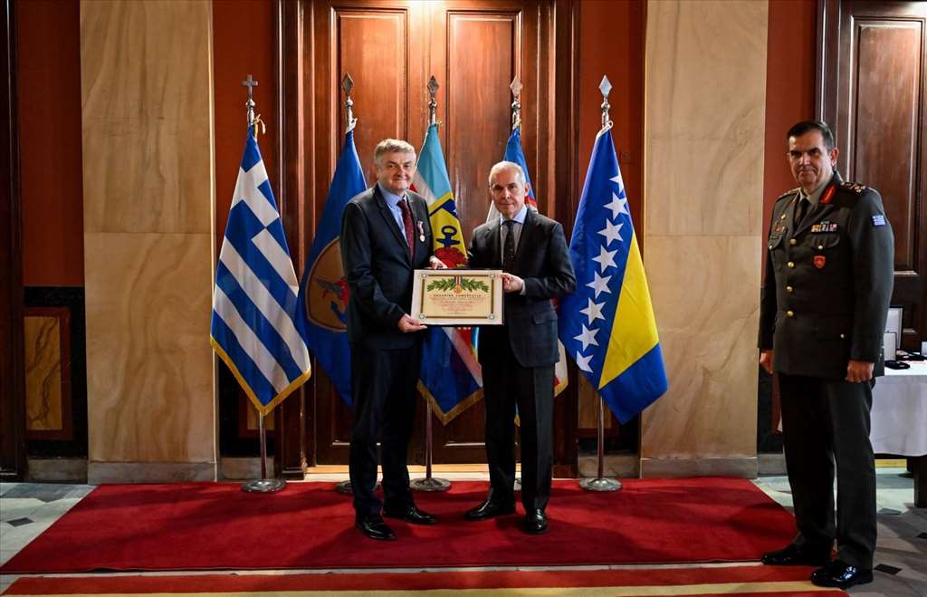 Ο Υφυπουργός Εθνικής Άμυνας, Θανάσης Δαβάκης, απένειμε σήμερα, Τρίτη 25 Νοεμβρίου 2025, Διαμνημόνευση Αξίας και Τιμής ως Διακεκριμένου Απόφοιτου της Σχολής Εθνικής Άμυνας στον Πρέσβη της Βοσνίας-Ερζεγοβίνης, Αντιστράτηγο ε.α Vukovic Dragan, σε τελετή που πραγματοποιήθηκε στις εγκαταστάσεις της Σχολής. Τον Υφυπουργό υποδέχθηκε ο Διοικητής της Σχολής Εθνικής Άμυνας Αντιστράτηγος Αθανάσιος Σαρδέλλης.