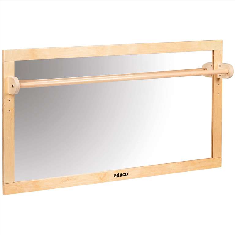 Mασίφ, άθραυστος καθρέπτης με ξύλινο πλαίσιο που περιλαμβάνει μια ξύλινη χειρολαβή, η οποία προσαρμόζεται σε 3 ύψη. Κρατώντας τη μπάρα, τα παιδιά μπορούν να σηκωθούν και να περπατήσουν κατά μήκος του καθρέπτη. Ο καθρέπτης μπορεί να τοποθετηθεί οριζόντια ή κάθετα. Εγκεκριμένο από τον AMI (Διεθνής Μοντεσσοριανή Κοινότητα).