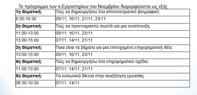 Όλοι όσοι αναζητούν εργασία και επιθυμούν να αναβαθμίσουν τις δεξιότητές τους στη διαχείριση της σταδιοδρομίας τους, μπορούν να παρακολουθήσουν e- Εργαστήρια στις εξής θεματικές ενότητες: